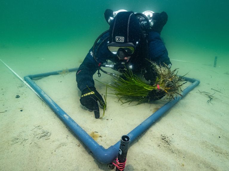 „Wir wollen, dass sich Seegras wieder dauerhaft ausbreitet, ganz ohne unsere Hilfe“, sagt Maike Paul von der Universität Hannover, Leiterin des SeaStore-Projekts. In der südlichen Ostsee arbeiten sie und ihr Team an den wissenschaftlichen Grundlagen für eine großflächige Renaturierung. An drei Standorten haben sie Seegras bereits wiederangesiedelt und sein Wachstum analysiert, um den langfristigen Erfolg zu sichern. Dabei sensibilisiert das Forschungsteam auch die Küstenbevölkerung und Touristen für den Schutz der Gräser. Und: zahlreiche Freiwillige unterstützen die Forschenden, indem sie ebenfalls in die Ostsee eintauchen und helfen, neues Seegras anzupflanzen.