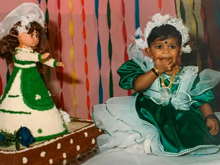 Wir zelebrieren einen tamilischen Kindergeburtstag. Es gibt ein ganzes Buffet an Torten, die wir alle selbst backen. Meine Mama hat zu meinem ersten Geburtstag eine Buttercremetorte gebacken und ein passendes Kleid genäht. An diese Tradition erinnern wir bei dem Community-Event. Mir ist wichtig, Themen wie Migration und kulturelle Identität im Rahmen der Mode rüberzubringen. Es ist zwar eine sehr bunte und kitschige Welt, aber es geht auch um ernsthafte Themen und eine sehr persönliche Geschichte. Wir wollen beide Seiten zeigen: wie schön es sein kann, einen kulturellen Background zu haben, aber auch mit wie vielen Herausforderungen das einher gehen kann.