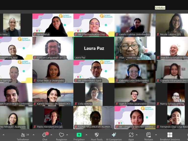 Heute koordiniert Paz Morales den Sprachclub, eines der größten Projekte des Netzwerks. Einmal im Monat schalten sich 30 bis 50 Teilnehmende aus Lateinamerika online zusammen, um Deutsch zu sprechen. Moderiert von Ehrenamtlichen tauschen sie sich in kleinen Gruppen aus, sortiert nach Sprachniveaus. Der Fokus liegt auf Austausch, nicht auf klassischem Unterricht. „Wir wollen einen sicheren Raum schaffen, in dem man ohne Angst Deutsch sprechen kann“, erklärt Paz Morales.